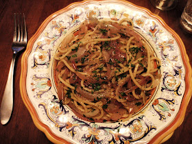 NOTE: If you want to make pesto the old fashioned way (and purists will tell you that real pesto can only be made this way), break out your mortar and pestle. (The word pesto, in fact, used to mean pestle in Italian, although it's now called pestello in modern Italian. And mortar is mortaio, in case you're interested.) In any event, start with your garlic and a pinch of salt and starting mashing the garlic. When it's a paste, add the pinoli, mash them, to a paste then start adding the basil leaves, little by little, crushing them into a paste before adding the next handful, adding oil as you go. Then add your cheese and test for seasoning. It's a lot of effort and, to my taste at least, not really worth it. But do try it once just to know what the real, real thing is like.