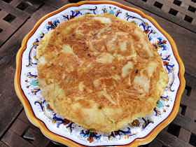 Now comes the tricky part: you need to cook the still-raw top of the frittata. There are different ways to do it. The most common--and, to my mind, still the best way--is to slide the frittata on to a plate, then cover it with another plate, flip it over and slide the frittata, uncooked side down, back into the skillet, having added un filo d'olio to the skillet beforehand. Another way to do it is to cover the skillet directly with the plate and then flip the frittata over. (I find it a bit too risky handling the hot skillet like this, but you can find special frittata pans-which are actually two interlocking non-stick skillet-specially designed for this operation.) And finally, the easier way is to run the frittata under a broiler so that the top cooks and then browns. I use this last method sometimes myself, but it never quite comes out as nice and crispy and golden brown as when you fry it--although you can hide that fact by flipping the frittata before you serve it.