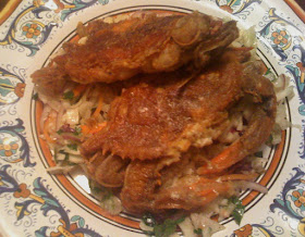 There are a number of other ways to fry soft-shell crabs. And even simpler version is simply to fry the crabs in oil or butter, without flouring. (I find this, however, a bit too simple.) Soft-shell crab can also be dipped in egg after flouring, not unlike Angelina's fried vegetables. You can also fry soft-shell crabs like Southern Fried Chicken, soaking the crabs in buttermilk before dipping in seasoned flour. You can also bread them as you would a chicken cutlet. They can be deep fried instead of pan fried if you like, but I find deep frying a bit too heavy and, in any event, less convenient for home cooking. Be careful when you fry soft-shell crabs, by the way, as they are quite 'juicy' and are liable to splatter. Wear an apron and be ready to jump!