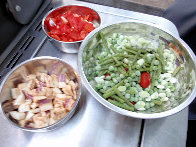 Step 1: Cut up and and set aside all the vegetables that you will need for Steps 2 through 4 (In professional circles, this is often called the mise en place or the 'putting into place' of your ingredients):