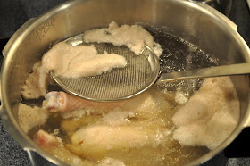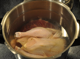 'arrosto morto', literally 'dead roasting' but more commonly referred to as 'pan roasting' in English. Hazan's version, on the other hand, has you adding white wine and allowing it to evaporate completely (in the usual Italian fashion) before adding enough broth almost to cover the shanks, then placing them, covered, in a hot oven to braise in the typically French manner. This "Frenchified" version is quite good, and I may like it even better than the original.