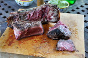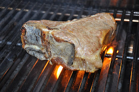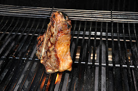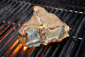 When you turn the steak over to cook on its other side, you will see the lovely cross-hatched grill marks that are the pride of so many 'grillmeisters' (see first photograph above). Now season the steak liberally with salt as the steak cooks on the other side, repeating the two and ten o'clock positions if you like. Turn the steak over and season it again on its just-cooked side. Finally, for a 3-inch monster, you can and should grill the steak on its flank for another five minutes or so, using the bone to prop the steak up. This will drive the blood away from the bone for more even cooking.