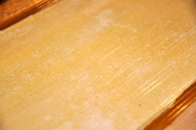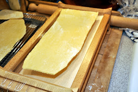 Then, with a rolling pin, begin to flatten the pasta against the strings.