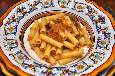 The typical pasta, as mentioned, is ziti, especially the long type that you break into sections by hand (pictured in the post on zitoni al forno) but another stubby pasta like penne would also do. I have seen recipes calling for bucatini, also know as perciatelli, a kind of thick, hollow spaghetti that is popular in both Naples and Rome (and is indispensible to make the Roman classic bucatini all'amatriciana).