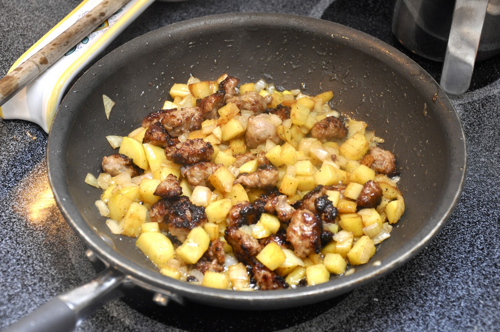 The recipe is a classic one, and admits a few variations. Besides the choice of cheese (which could also run towards fontina or another creamy cheese instead of a grated one), you can, of course, achieve a lot of variety by just your choice of sausage. And you can leave out the onion if you like, or substitute shallot or, if you want to get fancy, some chopped leeks.  And some recipes will call for parboiling the potatoes before sautéing them with the onion. That's an extra step that I've never tried and, to my mind, it takes away from the peasant character of the dish. But, of course, no one is going to  stop you if you like the idea...