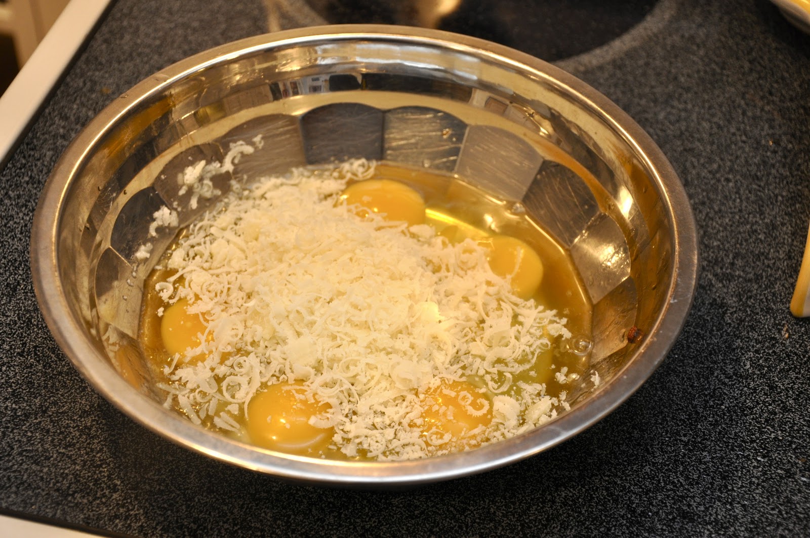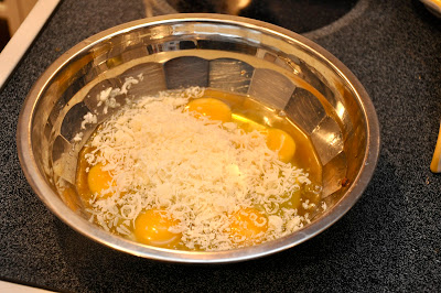 While those ingredients are getting acquainted, beat your eggs and grated cheese together in a bowl. If you are using pecorino, you should not need much salt, but with parmesan you will want to season the eggs a bit.