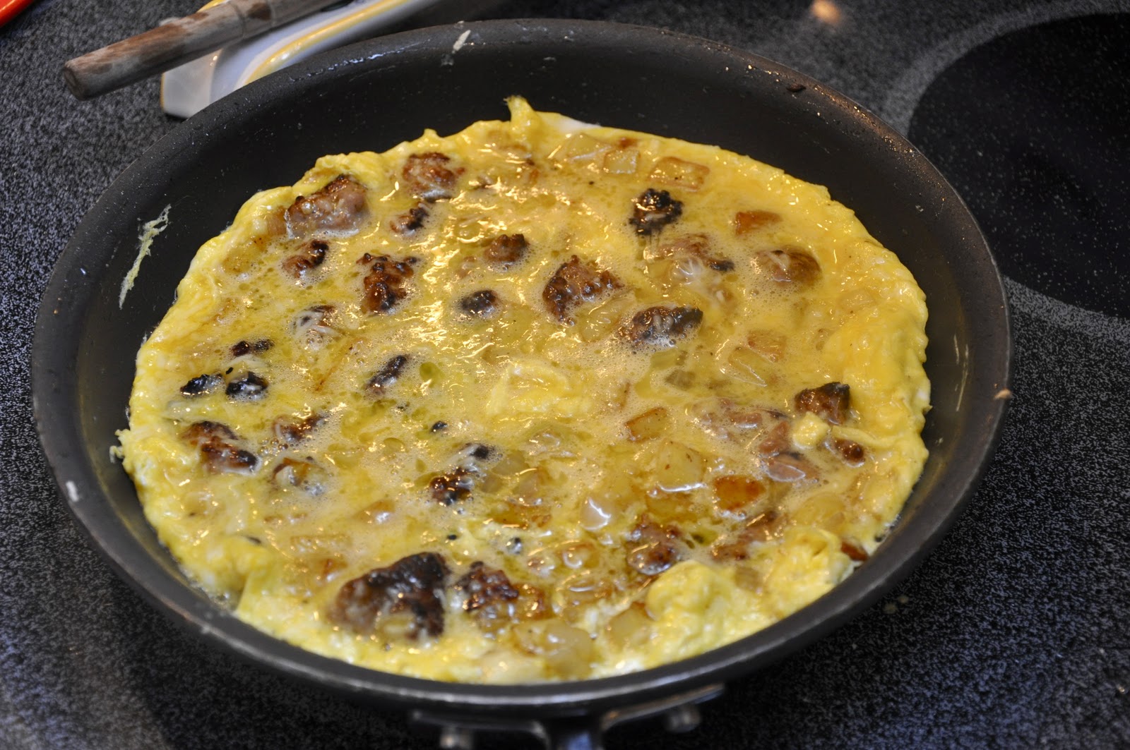 Once the flavoring ingredients are more or less evenly distributed though the eggs, stop and let the eggs cook, still over moderate heat, until they have almost entirely set, except for a thin layer of raw egg on top, and the bottom has nicely browned (but not too much). During this step, too, you can cover the skillet with a lid to help the eggs set. The whole process should not take more than 8-10 minutes. Use a spatula to check the bottom to make sure it's browning nicely but not burning. Regulate the heat if need be.