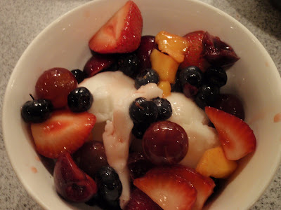 A macedonia can be made with almost any combination of fruits in season. Tonight I mixed some strawberries that looked particularly good at the market with blueberries, pitted cherries, seedless red grapes and some mango, which nicely set off the dark colors of the other fruits. You cut up the larger fruits into bite-sized sections, then toss them together with sugar and freshly squeezed lemon juice. Let the salad macerate for about 30-45 minutes in the fridge and there you have it! Serve by itself or over a scoop or two of sorbet. A marvellously refreshing way to end of meal.