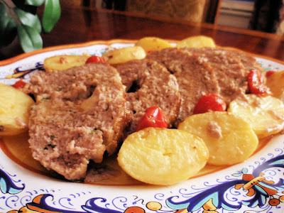 Now place the loaf in a baking dish. Angelina liked to add potatoes wedges to the dish to roast with the meatloaf--something I heartily recommend, because they soak up and absorb the wonderful flavor of the cooking juices. You can also add a few pachini (cherry tomatoes) or wedges of regular tomatoes if you like. I also like to add a few garlic cloves, with their jackets still on to prevent them from burning, to the dish. Sprinkle with olive oil, season the potatoes and other vegetables if using with salt and pepper. Splash on a bit of white wine and bake in a hot oven (200 C, 400 F) for 45 minutes to an hour, tossing the potatoes and basting the loaf from time to time with the cooking juices, until the polpettone is nicely browned and the potatoes are tender and just lightly spottled on the outside. You can test the internal temperature of the meat (it should be at least 65 C, 150 F). The potatoes are done when you stick a knife in them and the potato stays where it is when you lift it out. (Thanks to the Rouxbe Online Cooking School for this useful tip!)