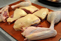 Using the rest of the duck: Ducks are not cheap, but you can use just about every bit of them one way or another. As mentioned above, the back (trimmed of its skin), neck and giblets make a very fine duck stock, which can be used like any other stock for risotti or soups, or to add flavor to a stew. And don't throw away the skin or excess fat: you can render the fat out by putting it in a skillet just large enough to contain all the bits of skin and fat in one layer, just cover with water and allow to simmer very gently until the water has evaporated and the skin has given off all of its fat and is nicely brown. Pour off the rendered fat into a jar and keep it for cooking—it is absolutely fabulous, for example, for sautéing potatoes. And the cracklings (the crispy brown bits of skin left over from rendering out their fat) are delicious just sprinkled with a bit of salt and pepper. In my house, this is a special treat for the chef...;)