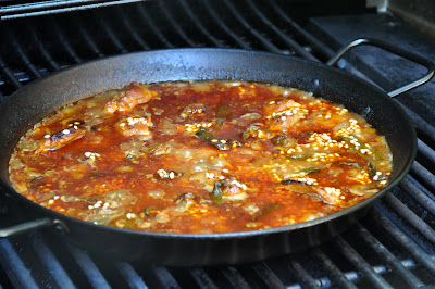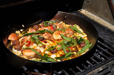 Heat a well-seasoned paella pan over high heat, preferably on a barbecue or, even better, a paella burner. (If you don't' have either, you can make paella perfectly well over the stove, but it will lack that characteristic lightly smoky flavor.) When hot but not burning, add enough olive oil to cover the bottom of the pan and sauté some Mexican chorizo. Meanwhile, char a couple of chiles poblanos over the flame and, when nicely charred on all sides, remove them and let them cool a bit, covered with a cloth or in a paper bag.
