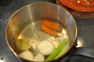 You begin with the meat. Classically speaking, this is a veal roast (see Notes below for the common cuts). But you can economize by using pork loin or—my favorite—pork tenderloin or turkey breast instead. Whichever you choose, prepare a kind of court bouillon by simmering a quartered onion, a carrot, a stick of celery, a bay leaf, a few cloves, salt and some whole peppercorns in a mixture of white wine and water, about a glassful of wine and just enough water so that the liquid will entirely cover the meat when it is placed in the pot. (To be sure, you can place the meat in the cold liquid beforehand to see if there is enough liquid.)