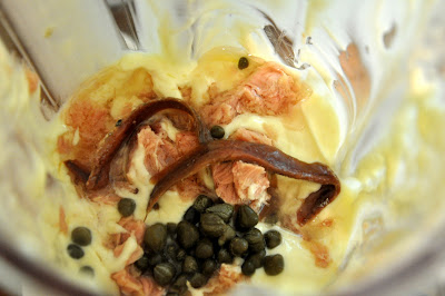 In any event, once your mayo is ready, add a fillet or two of anchovy, a spoonful of capers and a can of tunafish (preferably packed in olive oil). Blend again until smooth.