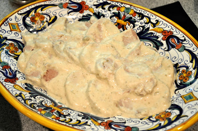 You can also simplify the dish a bit by doing what most recipes call for: rather than coating each slice of vean in the sauce, line the bottom of your platter with some sauce, lay down the slices and cover them with the rest of the sauce. The slice by slice method is my own 'take' on the recipe, but one that I think pays off, as it ensures that each and every slice is enveloped in the sauce, keeping it moist and lending maximum flavor.