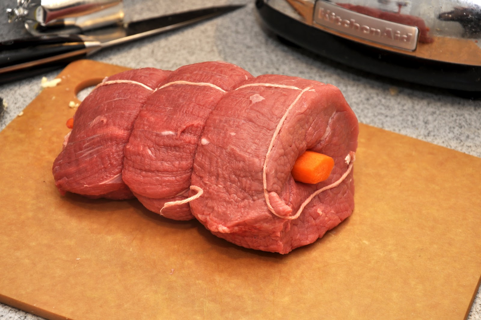 As you can see, the knife should come out the other side. It should then be a fairly simple matter of shoving the carrot through the roast, trimming off any part of the carrot that sticks out on either side.
