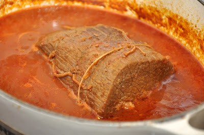 Allow the pot to come to a simmer, lower the heat and cover the pot. Let the roast braise until it is quite tender, turning every 15 minutes or so and adjusting the heat so that the tomato sauce simmers very gently (what the French call 'mijoter'). Most recipes call for a cooking time of 2 hours, but it may well take longer, up to 3 hours, depending on the meat and the size of the roast. Add water or broth if the sauce gets too thick, and adjust for seasoning at the end of cooking.
