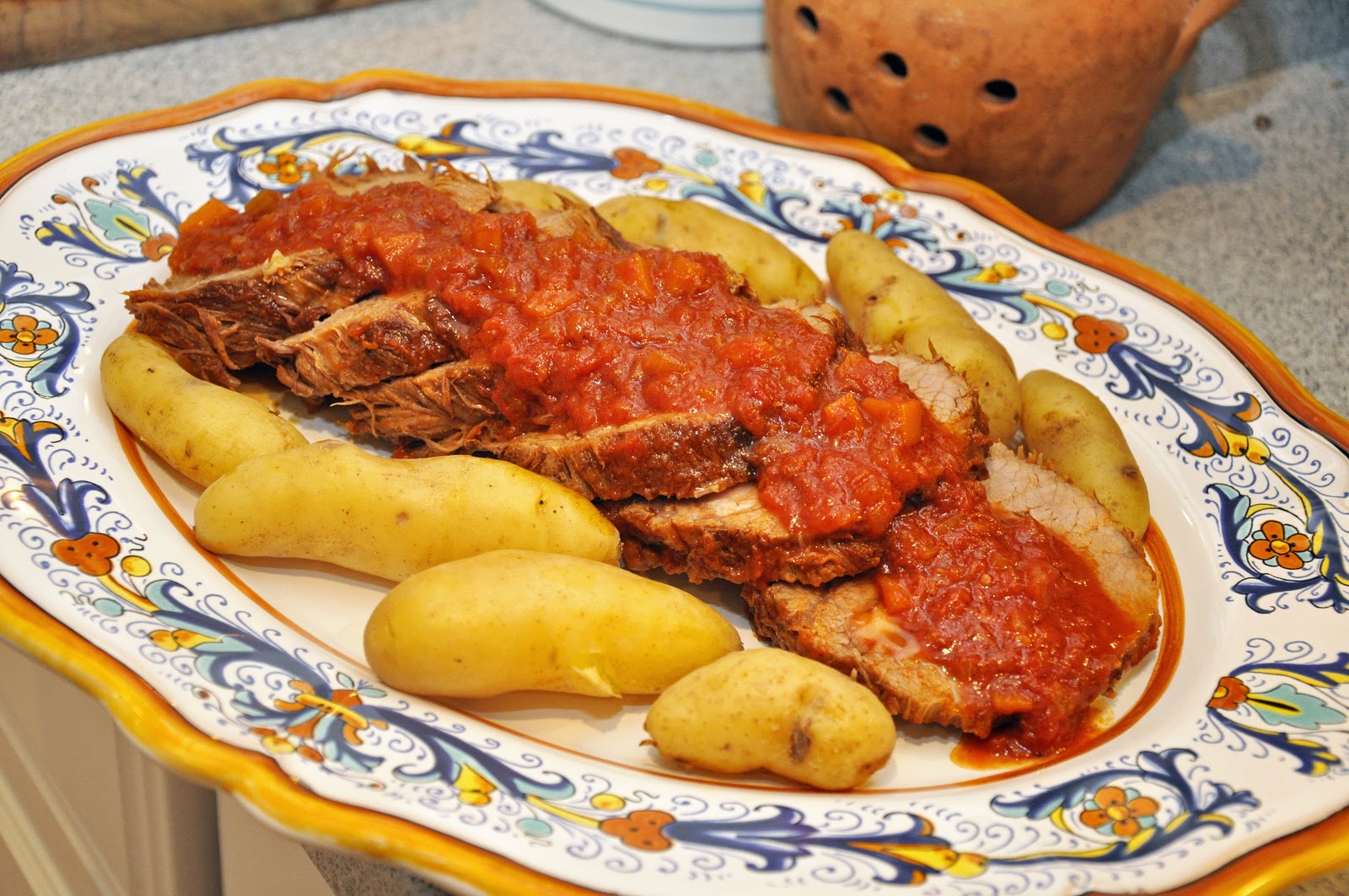 Serve, sliced, on a warmed platter with boiled potatoes. Pour some of the tomato sauce over the roast slices and serve the rest in a gravy boat for guest to add more, which they are very likely to do.